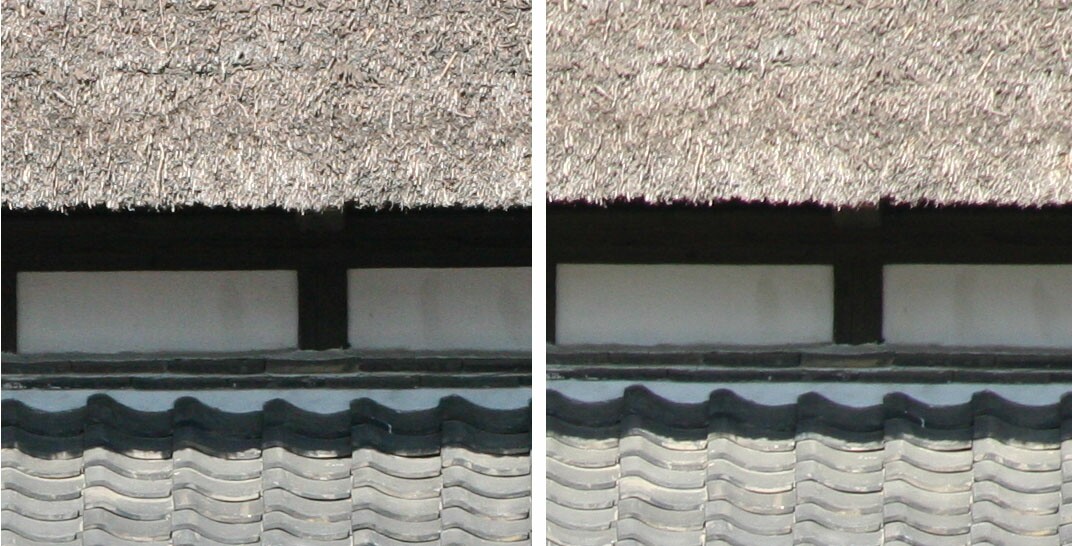周辺部の画質もよい。比較写真では上方周辺部を比較した。わらぶきの屋根の描写力が異なっている。