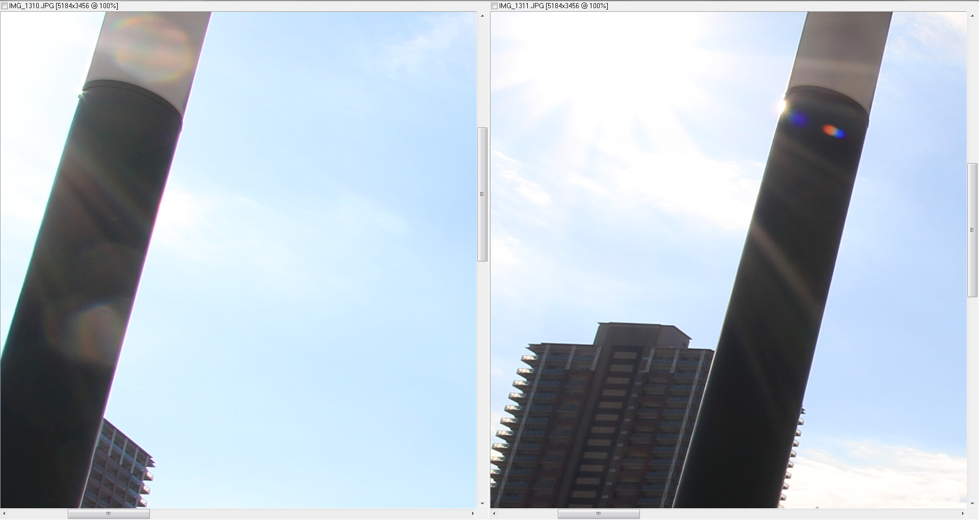 左のキヤノンレンズには鉄柱周りに紫色の偽色が現れています。