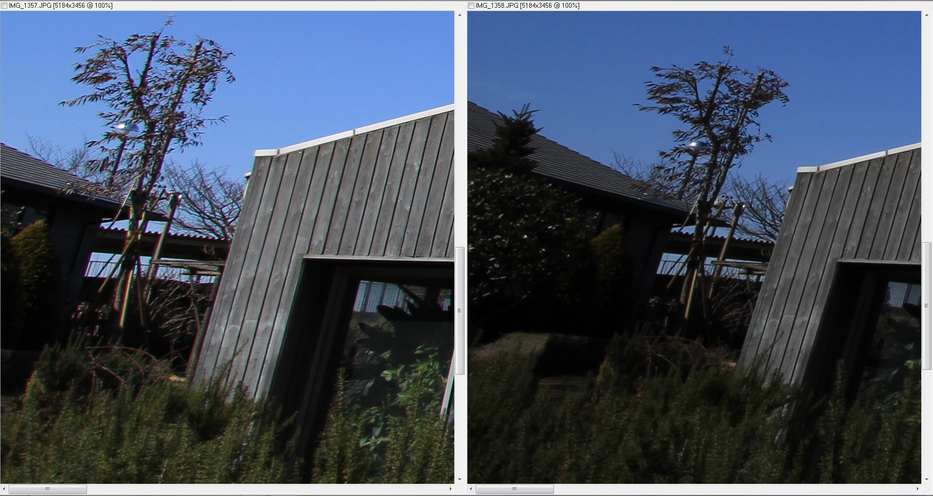 左 EF-S 10-22mm 右 シグマ8-18mm 画像の左端中程の部分を比較しました。 左のEF-Sでは屋根回りや木々の間に偽色あり。 シグマは偽色を押さえ込んでいます。ナイス! でも素人の実験です。条件がすべて揃っているわけではありませんので、参考としてご覧ください。