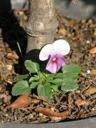 | 植木の根本に咲くパンジー 種が飛んだんですかね。 |