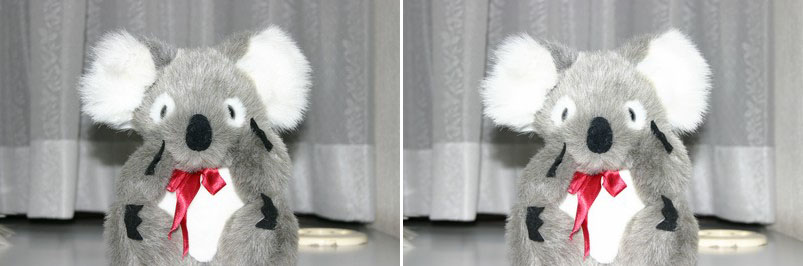 | 左:補正なし 右:+2/3補正あり 補正後の画像は耳とおなかにやや白飛びあり。 E-TTLの特徴を考えて、グレーの頭の部分に合焦。 ヒストグラムを見ると、「補正なし」が適正な結果です。 |
