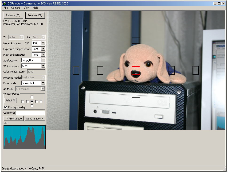| 1.まず、BreezeBrowserで有名なBreeze Systemから10DRemoteというソフトをダウンロードして、PCにインストールします。 これはPCからカメラをコントロールするシェアウェアですが、試用できます。試用期間中は画像が保存できないという制限があります。 2.Kiss Digitalに付属のUSBケーブルでPCとKissをつなぎます。そしてKissの電源を入れます。 3.10DRemoteを立ち上げます。そしてPreviewを押すと下の画面が出てきます。(これはWin2000のものです。) Previewも何も押さないと、画像は表示されません。 |